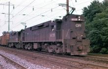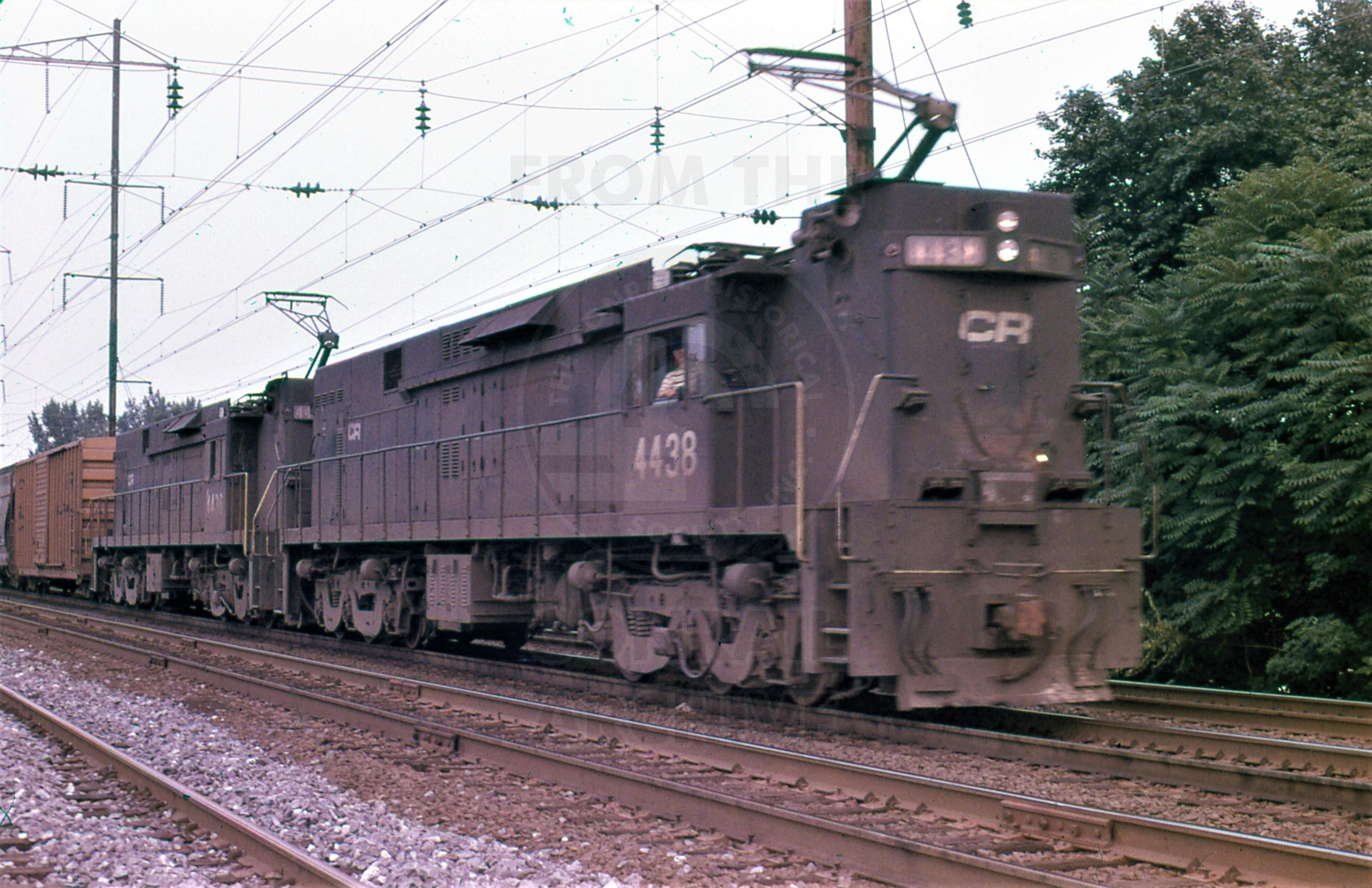 Conrail. E-44 #4438 & #4436 west bound on track 2 at Jersey Avenue station, New Brunswick, NJ. August, 23, 1979