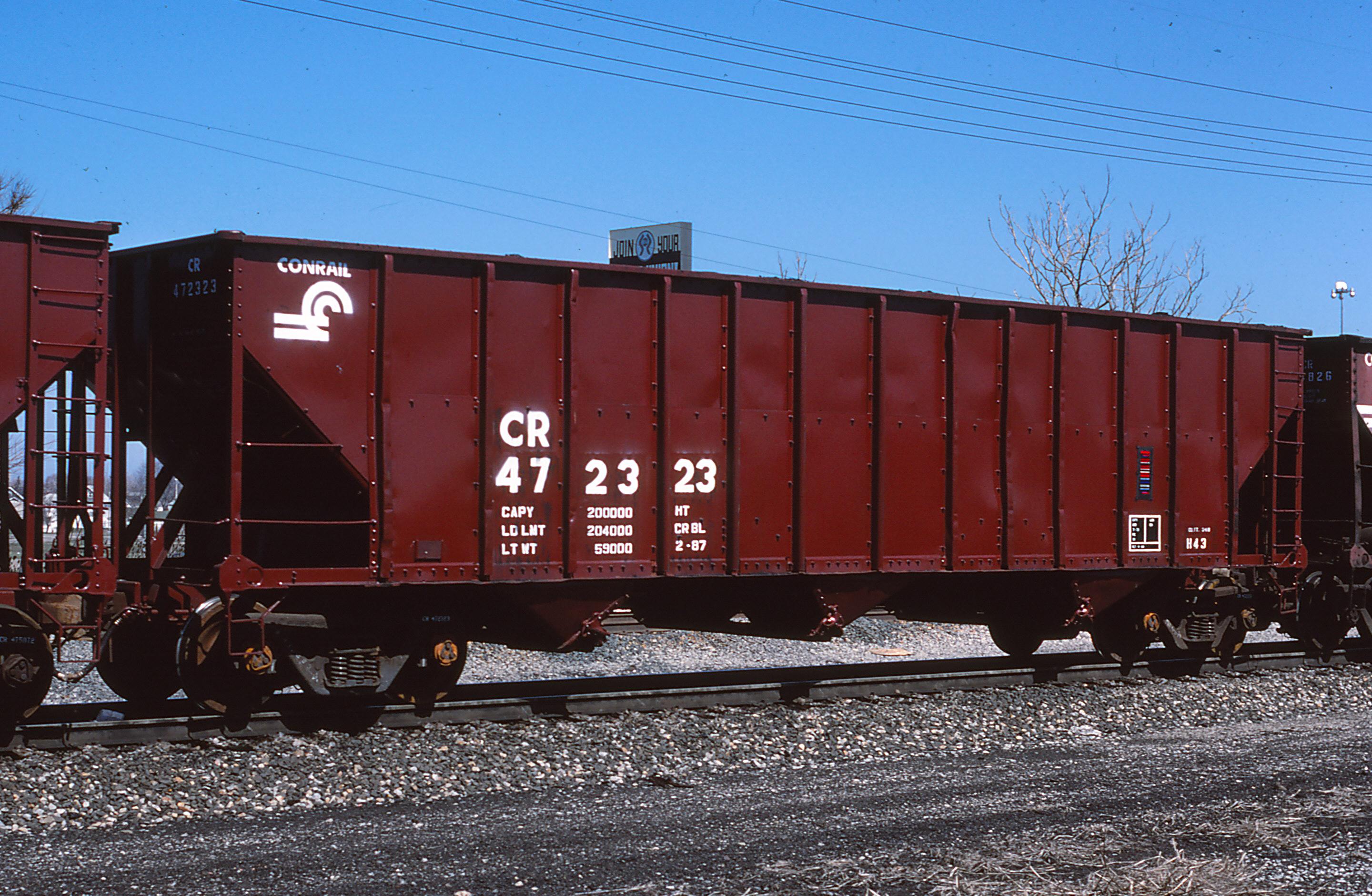 CR 472323 is seen at Cleveland, OH on 4/7/87. Car is ex PRR 180340, built 4-64 and was painted CR-BL 2-87.Itwas laterrebuilt andbecame CR 506544, a CR G52Rclass Coalporter, in 1-93. Car was deleted 1/7/11 by NS.