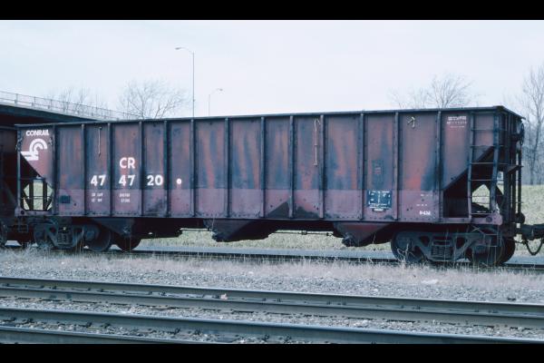 Car is ex PRR 225762 and was built 5-65. Pictured here likely in winter 1989/90 near the reclamation shop in Hollidaysburg, about to be cut down to the frame for the new coalporter program. It was rebuilt 2-90 into CR 503014 class G52H coalporter. Color print scan.