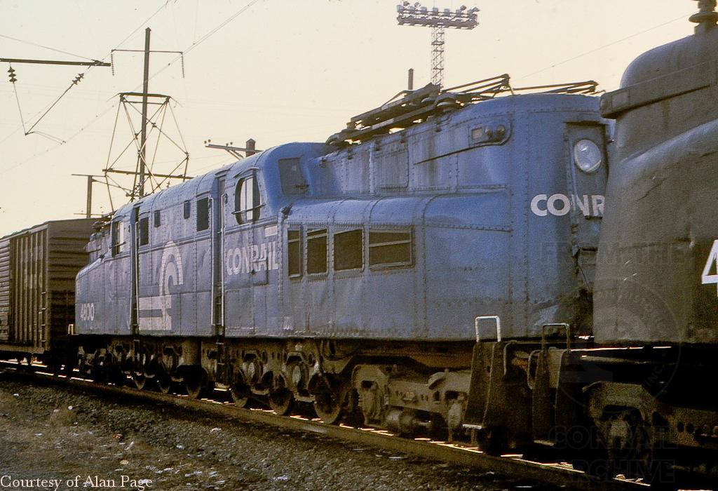 CR GG-1 4800, "Old Rivets," pulls at the rear of a trio of G's at Morrisville yard in February, 1979