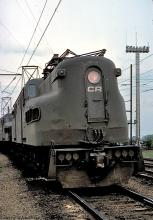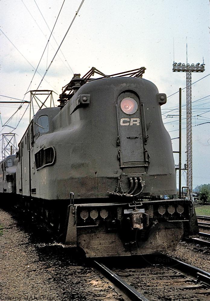 CR GG-1 4849 leads sister-unit 4828 with a mixed freight through Morrisville yard in April, 1977.