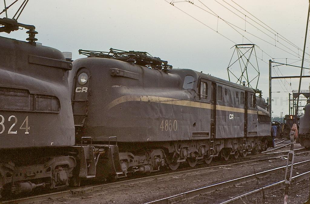 CR GG-1's 4824 and 4850 rolling into the Enola engine facility in May, 1977.