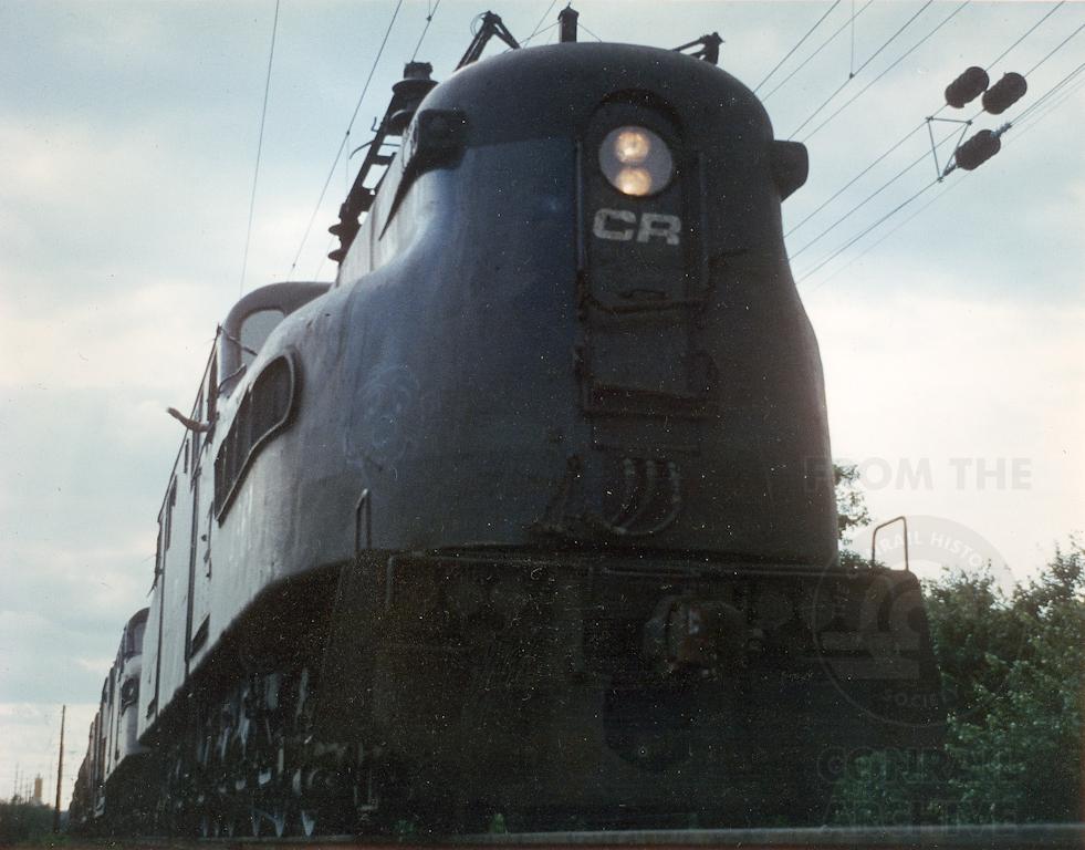 While I took an overall view of the pair of GG1's beginning to roll eastbound, my buddy stayed trackside and received a wave from our host engineer. While waiting for clearance earlier, the engineer invited us up for a great view inside the cab of 4861. By the way, I wonder who drew the cartoon face on the grimy black nose? Photo by permission. Scanned from an 8x10 print.