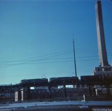 CR 4877 leads a pair of GG-1's pulling a mixed freight on the ex-PRR highline at 30th Street Station in August, 1976.