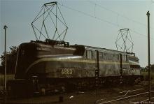 Late on a July, 1977 day, CR-operated GG-1 4883 has both pans up at the South Amboy engine terminal.