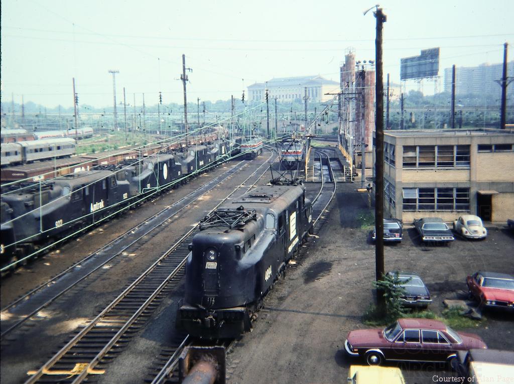PC GG-1 4894 navigates the 30th Street Station yard past a line of Amtrak GG-1's in August, 1976.