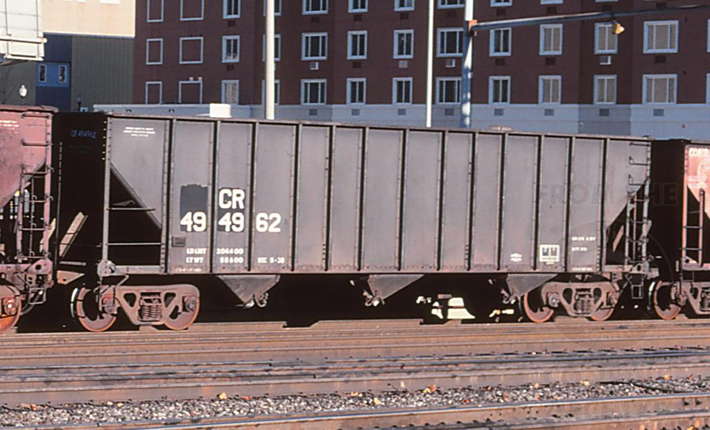 Previous Next Photo By Jeff Weaver CR 494962 is seen in the consist of a WB at Altoona, PA on 11/24/96. Car is ex HLMX 10085/TWRY 10085/C&O 87666. Car was later restenciled to HLMX 494962 after the lease had expired. Year 1998 Original Date 11/24/98 Conrail Number 494962 Collection CRHS Conrail Photo Archive Contributions