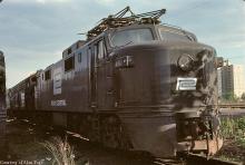 PC EP-5 4973 (PC-reclassed as E40's) leads a sad lineup of E-8A 4270 and other retired GE EP-5's at Harrisburg in May, 1977.