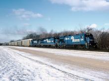 Conrail 5018 leads Eastbound BRSE-1 on track #1 near MP 120.2 in North Kingsville, Ohio.