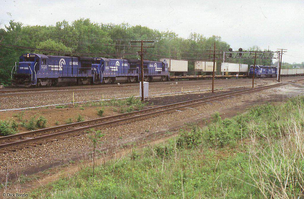 Conrail B36-7 5020 is leading a westbound TV train through Cresson, PA in 1986.