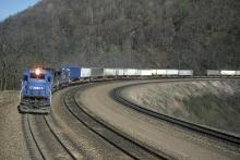 Like the GP40-2, the B36-7 was suited to hauling lighter, faster trains. Here, three of them charge up Horseshoe Curve in the late spring of 1986.