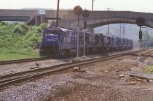 Conrail B36-7 is seen leading a barrage of other GE units westbound through Port Royal, PA in 1986.
