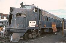 Former PC FL9 5032 rests on freight car trucks outside the Juniata Locomotive shops in August, 1977.