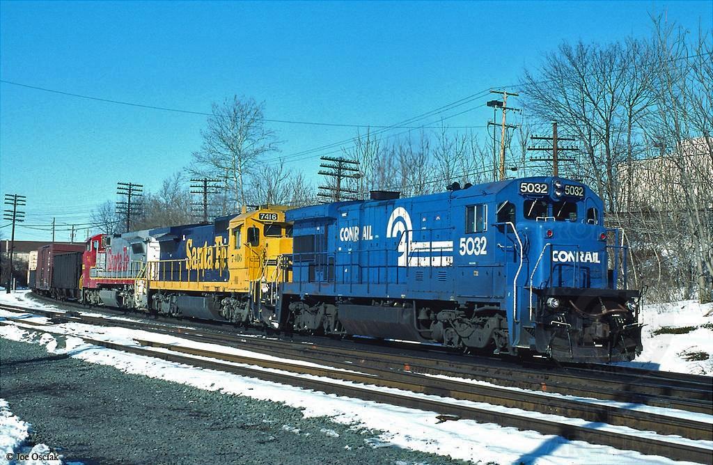 Conrail B36-7 5052 is leading a pair of Santa Fe units on PIOI at CP-Belt in Reading, PA on 2/27/1994