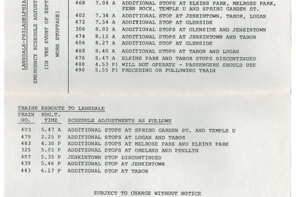 RDG Division Conrail notice for Lansdale to Phila Septa TWU strike adjustments March, 1977