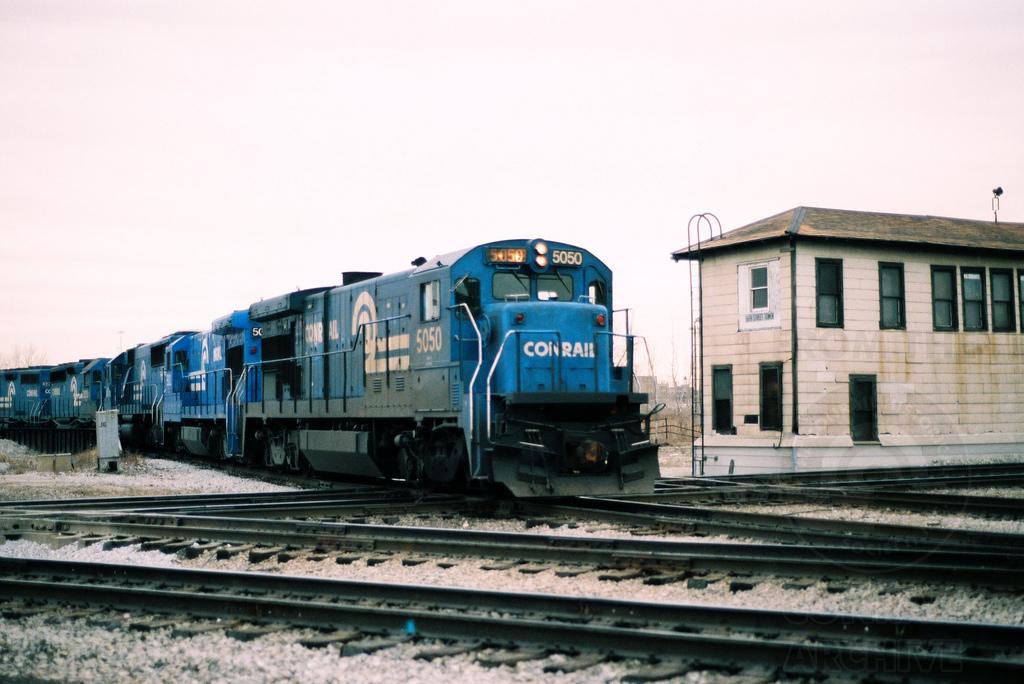 This is actually a westbound Conrail double-stack train destined for C&NW's Global One as it passes CNW's 16th Street Tower. It entered Global One at Ogden Jct. and used the Foreign Lead to Morgan Street. The train then took head room on the St Charles Air Line in order to back into the Extension Yard. This took place on a Sunday afternoon in February 1990. Doug Davidson photo with permission