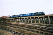 In February 1990, a Conrail double-stack intermodal train behind CR 5050, 5002, 6778, 3356, and 3201 climbs the west approach to the St. Charles Air Line. The train is taking headroom before backing into C&NW's Extension Yard at Global One. Doug Davidson photo with permission