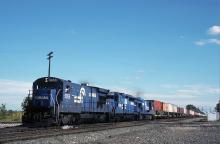 Eastbound vans pound the C&O/TT diamond at Vickers in Toledo, Ohio, with CR 5055, 3340, and 5028 in charge, standard 80's TV train power on Conrail.