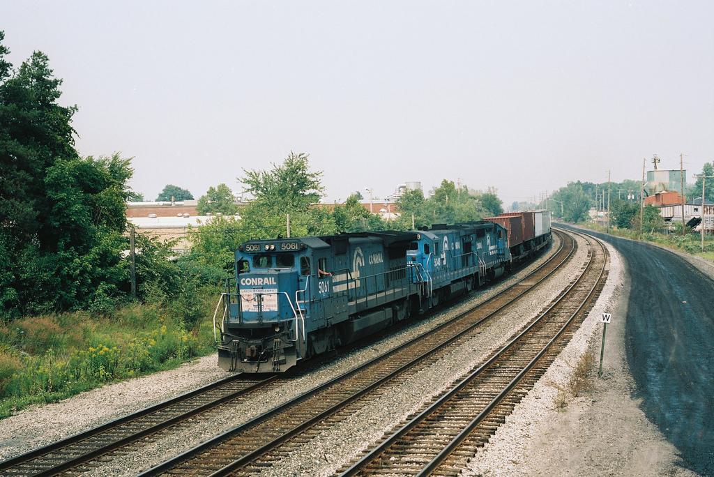 A westbound Conrail TV train behind B40-8 No. 5061 in a view from Berea Tower on August 25, 1991. Doug Davidson photo with permission