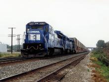 Conrail 5067 leads an Eastbound stack train near MP 83 ( passing by its' birth place just out of view to the right ~ GE Transportation Systems) on track number one.