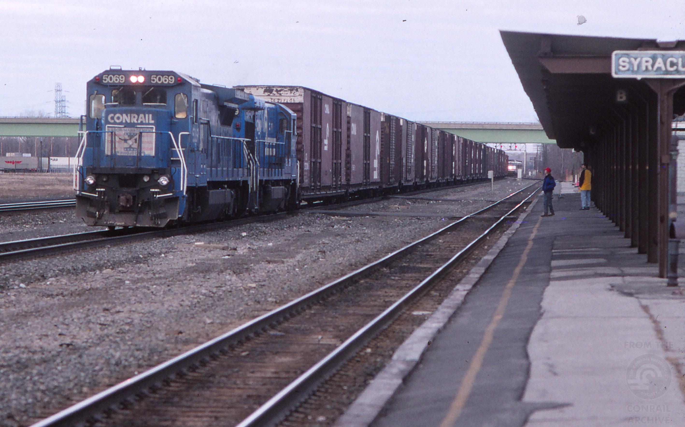A pair of GE's, 5069 and 5059, lead 112 cars of what looks like SETO through Amtrak's Syracuse station. An Amtrak Turboliner is poking its nose around the freight as it approaches the station.