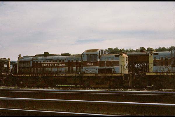 Former EL RS-3 1044 (CR 5260) rests retired between sister-unit 1018 (CR 5238) and ex-PC S-2 9824 in the Juniata shops deadline in August, 1977.