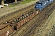 Conrail 530809 is seen behind CR 6013 at East Conway, PA. The single short grab on the C39-8 helps date this photo to 1986-1987, as these locomotives had the short grab replaced with a pair of L-shaped grabs to enhance safety for crew members shortly after they were delivered. The car behind 530809 appears to be loaded with a scrapped ore jennie.