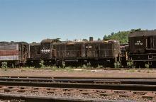 CR RS-3 5388 (ex-CNJ 1563) rests retired between ex-EL E-8A 822 and CR crane 50152 at the Juniata shops deadline in August, 1978.