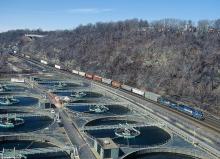 An eastbound traverses the former PRR main, adjacent to Alcosan, Pittsburgh's water treatment plant.