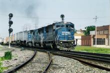 Conrail Mail-4 with the 5517 on the point leads off the day at Union City, OH on May 27, 1999