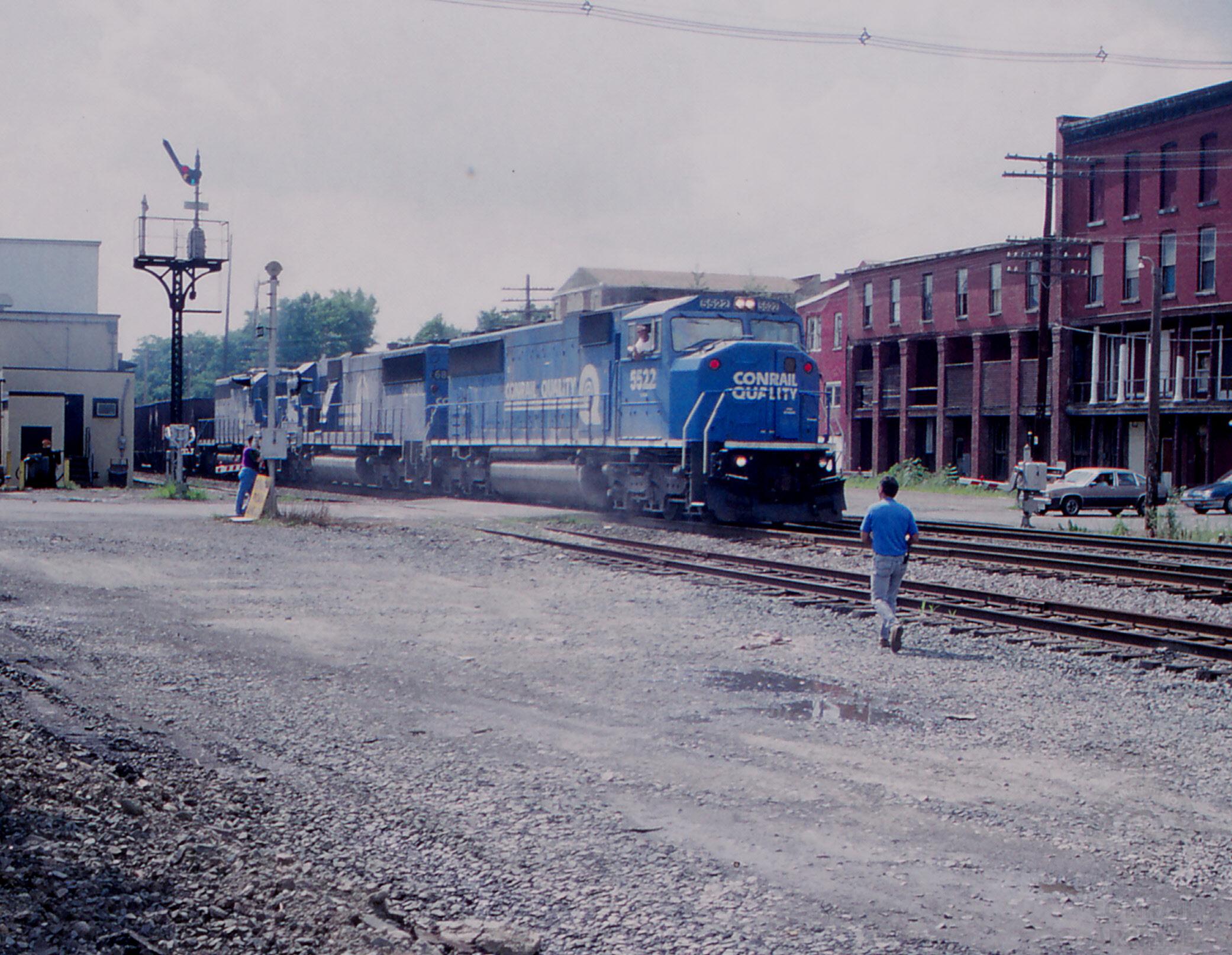 A pair of SD's and a C40-8W lead a 109 car UNG train past the semaphore at Waverly as it makes its way to NYSEG's Goudy Station in Johnson City.