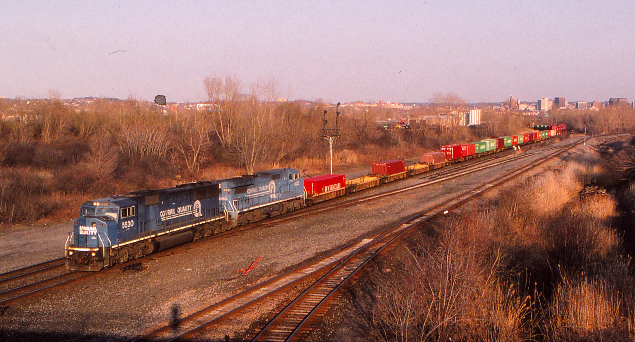 The end is near as an SD60I and C40-8W roll a westbound stack train into the afternoon sun past CP 293. The track to the right is the connection to the NYSW, once the DLW Syracuse Branch. That line passed under the old NYC here, eventually reaching Oswego. The Willis Av overpass gives a commanding view of the Syracuse skyline behind the train. The NYC passenger line that went downtown-part of that line is now I 690-also diverged here, near the curve the train is rounding, in the distance.