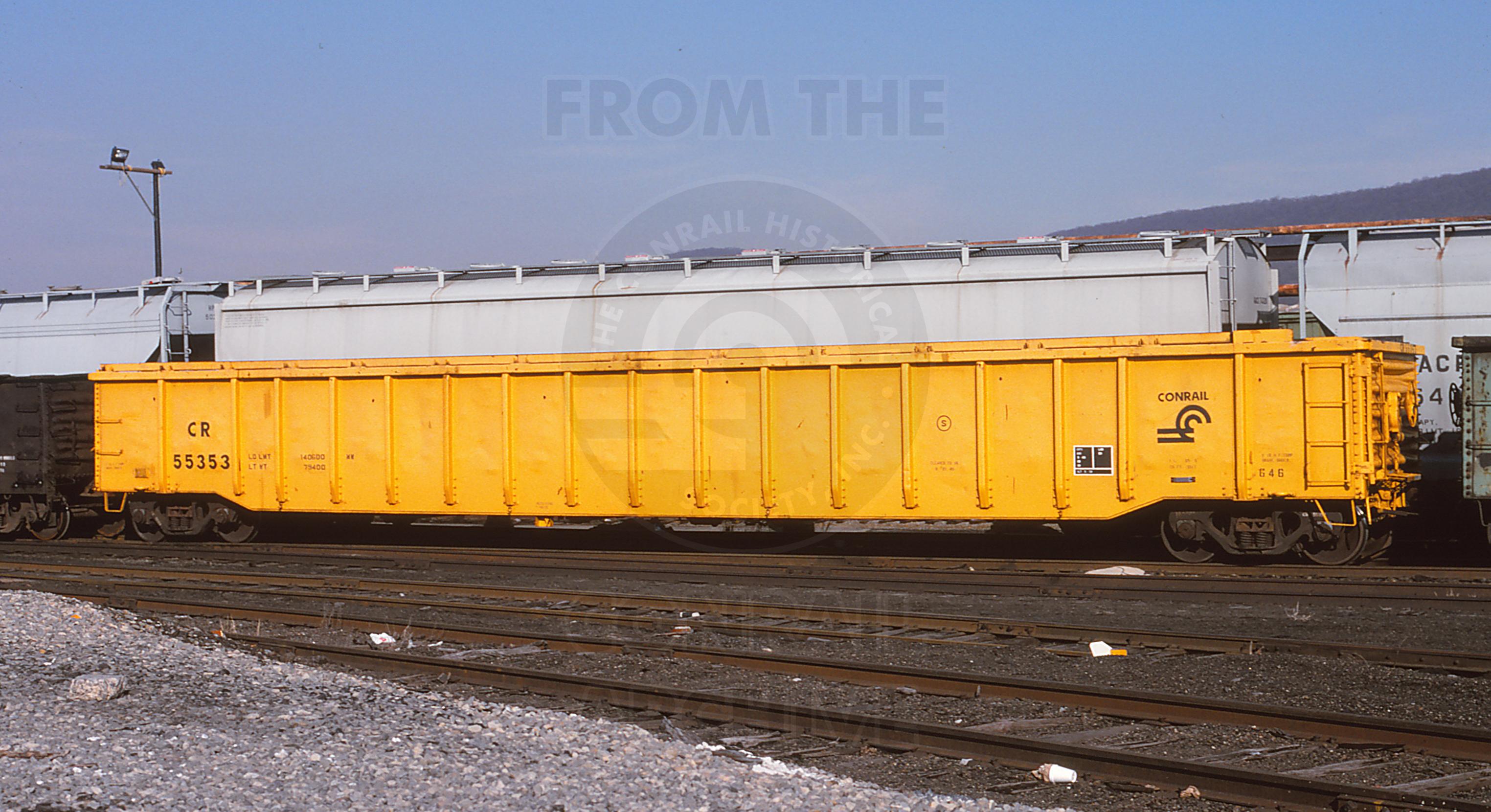 Previous Next Photo By Richard Louderback Collection of Chris Carangi CR 55353 is seen at Reading, PA on 2/18/95. Car is ex PC 598702 and was built 5-72 by Fruehauf. Year 1995 Original Date 2/18/95 Location Reading PA Equipment Type Class G46 Conrail Number 55353 Collection CRHS Conrail Photo Archive Contributions