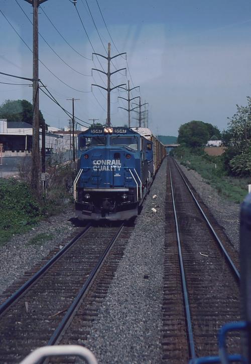 CR SD60M 5547 leads empty autorack ML-401 west by my train the PICA-0X at West Lawn, PA on Conrail's Harrisburg Line. The view is from GP40-2 3351 and we are hauling an extra empty gondola train heading to South Philly for reloading. At a combined passing speed of about 90 mph, it's a wonder the shot didn't blur! In just a few days, Conrail as we know it would cease to exist...