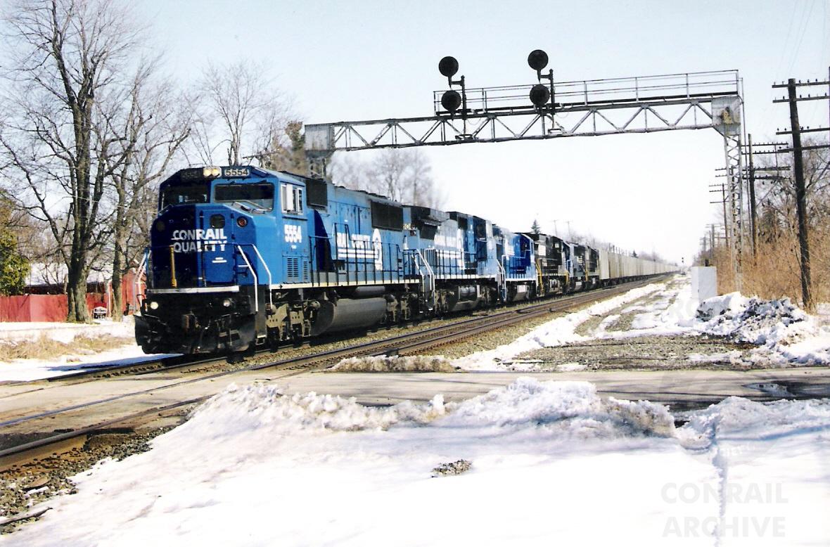 Conrail SD60M 5554 leads a mix of NS and CR power on SEEL -2 under the CP-367 signal bridge at Waterloo, IN on March 12, 1999. Jason Hall photo, Chris Howe collection