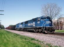 Conrail 5572 leads westbound Conrail UAZ-63 as it approaches MP137 [Broadway Ave] in Geneva, Ohio on track no. 2 [on Conrail's Chicago line].