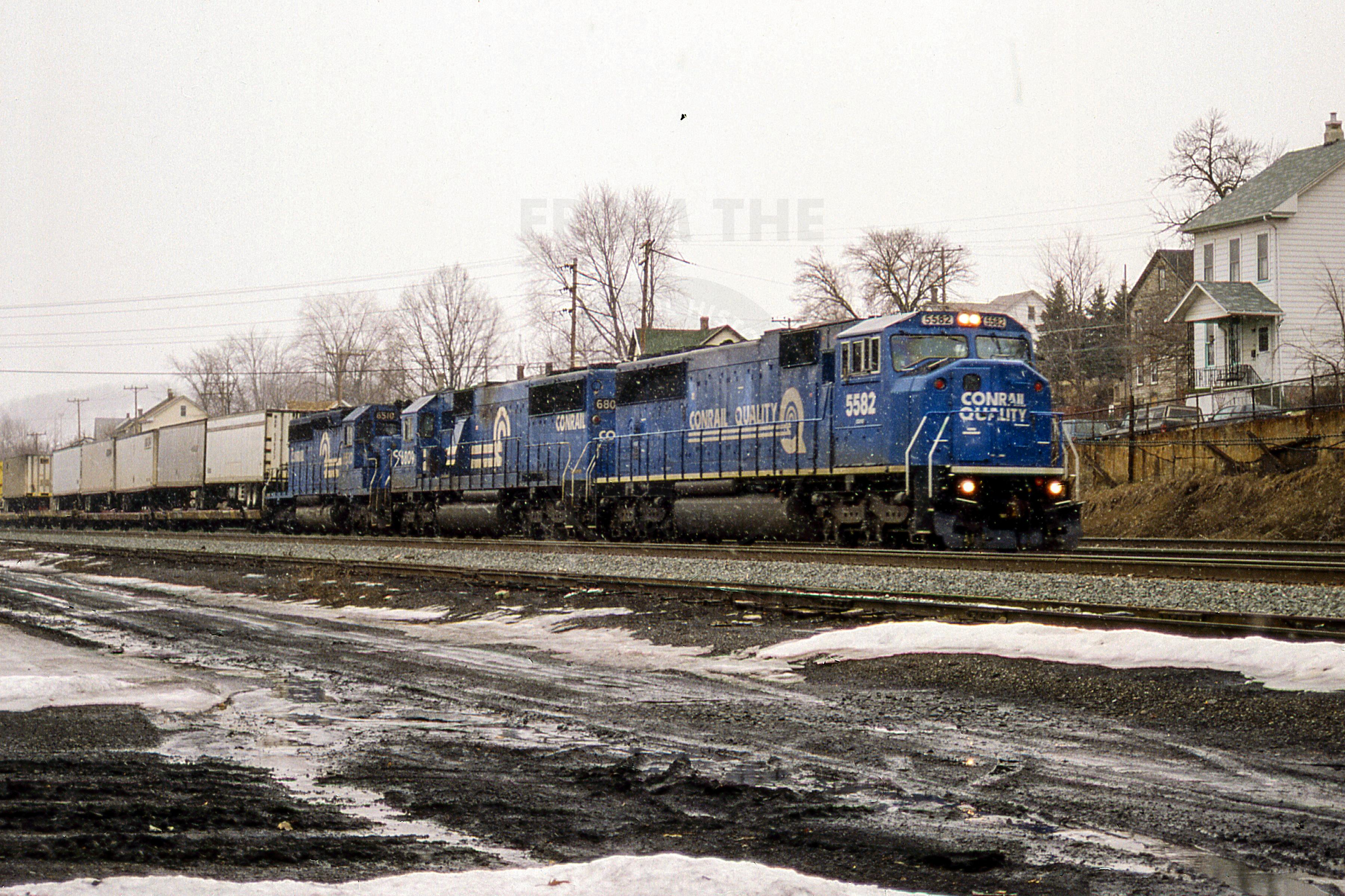 Previous Next Photo By Rich Bowes CR 5582 EMD SD60IPITTSBURGH LINE ALTOONA PA WITH TRAIN TV2H Year 1996 Original Date 3/1/96 Location Altoona PA Equipment Type EMD SD60I Conrail Number 5582 Additional Galleries Rich Bowes' Conrail Photographs Line or Locale Conrail's Pittsburgh Line East Slope West Slope and Horseshoe Curve Operations Collection CRHS Conrail Photo Archive Contributions
