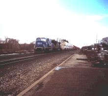 Previous Next Photo By Chris Howe CR 5645 and a NS GE leads TV261 by the old passenger station in LaPorte, IN on February 9, 1997. Year 1997 Original Date 2/9/97 Location LaPorte IN Conrail Number 5645 Additional Galleries Chris Howe's Conrail action 1997 Collection CRHS Conrail Photo Archive Contributions