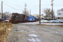 Conrail GP7 No. 5674(note the N5K caboose 18443 behind the engine) has the traffic on Indianapolis Boulevard stopped as it pulls a cut of tank cars from the American Maize plant in November 1979. Doug Davidson photo with permission