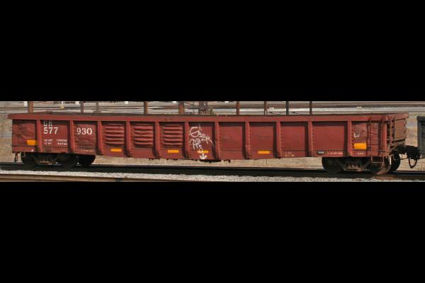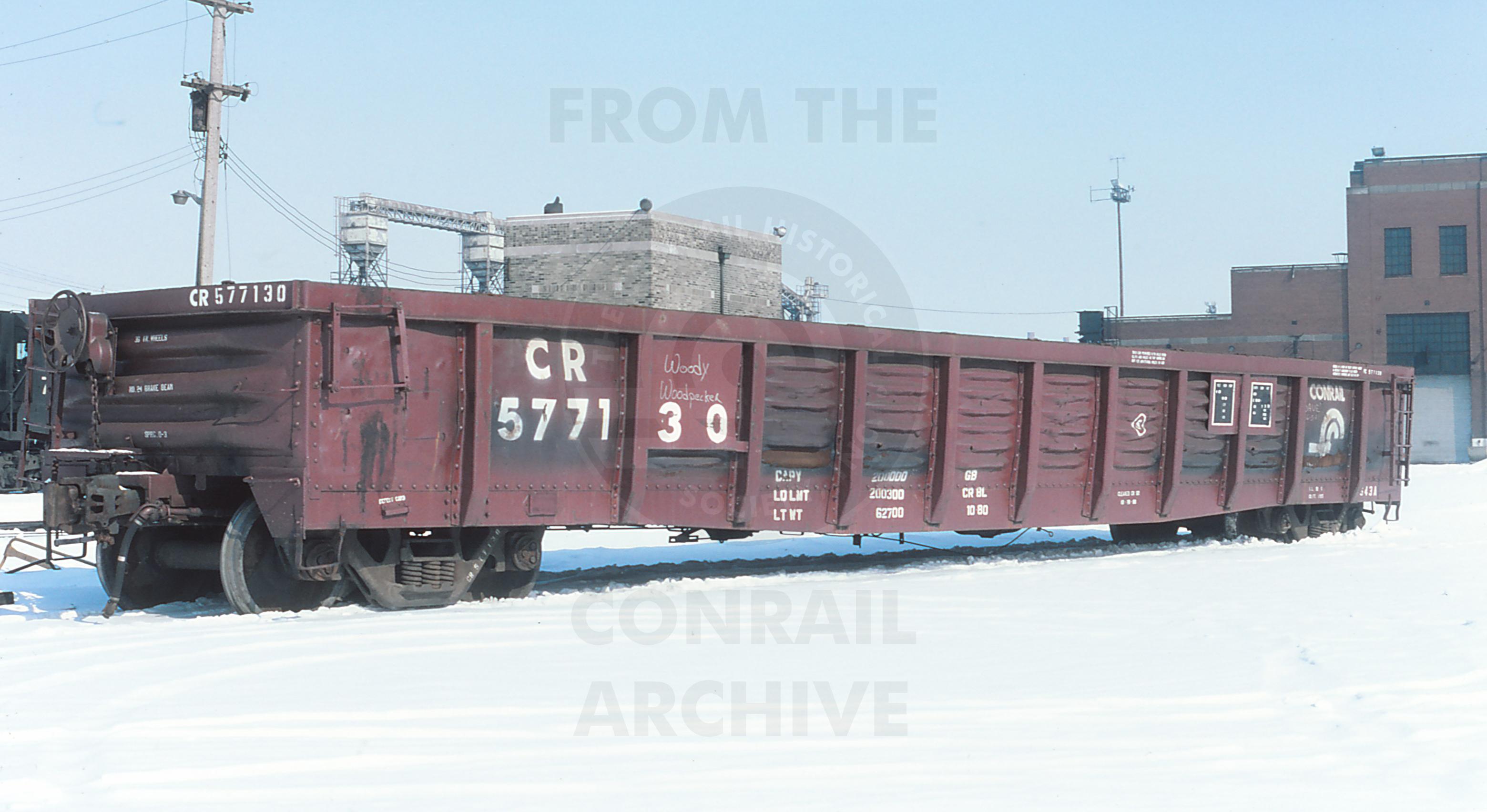 CR 577130 is seen at Cleveland, OH on 2/13/82. Car is ex PC 577130, built 4-68 and was painted CR-BL 10-80. It was deleted by NS on 12/1/00.