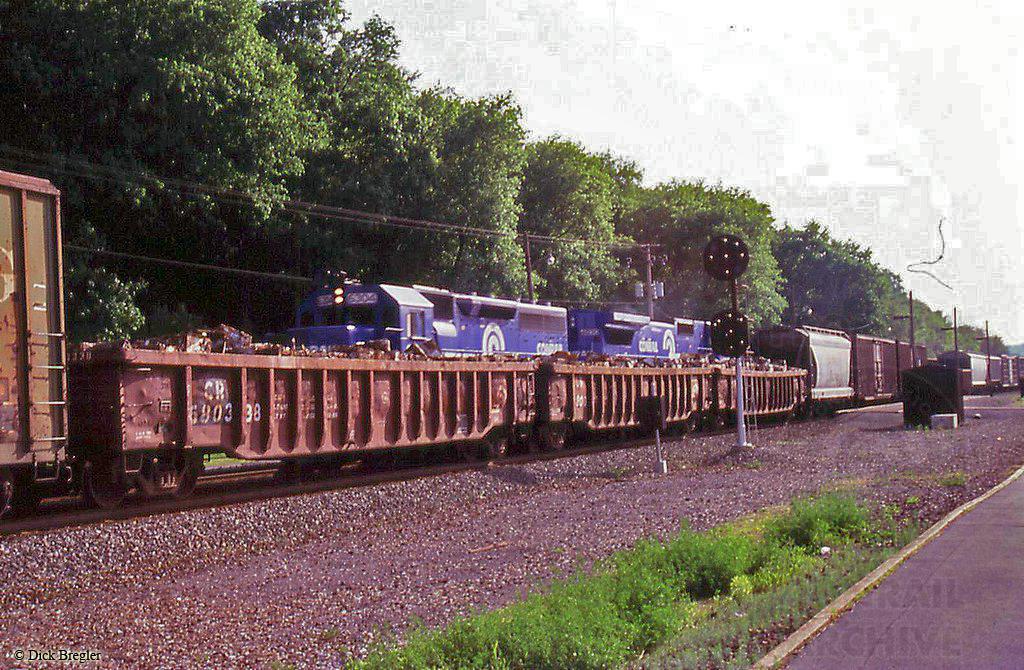Conrail class G47 580338 gondola is seen at Lewistown, PA in 1992.