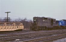 Freshly stenciled CR GP-7 5817 (ex-RDG 625) works Abrams yard with SW1500 9591 in February, 1977.