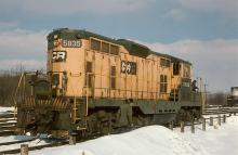 With CR GP-7 5838 (ex-RDG 636) in the background, CR GP-7 5835 (ex-RDG 633) works Abrams yard in March, 1978.