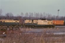 Former RDG GP7 635, soon to be stenciled 5837, rests with an SW1500 at the Abrams engine terminal in February, 1977.