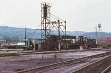A 1982 shot of the Lewistown yard shows GP7 5872 (ex-PC 5872, exx-PRR 5872, nee-PRR 8572) and SW9 9137 (ex-PC 9137) sitting by the sand tower.