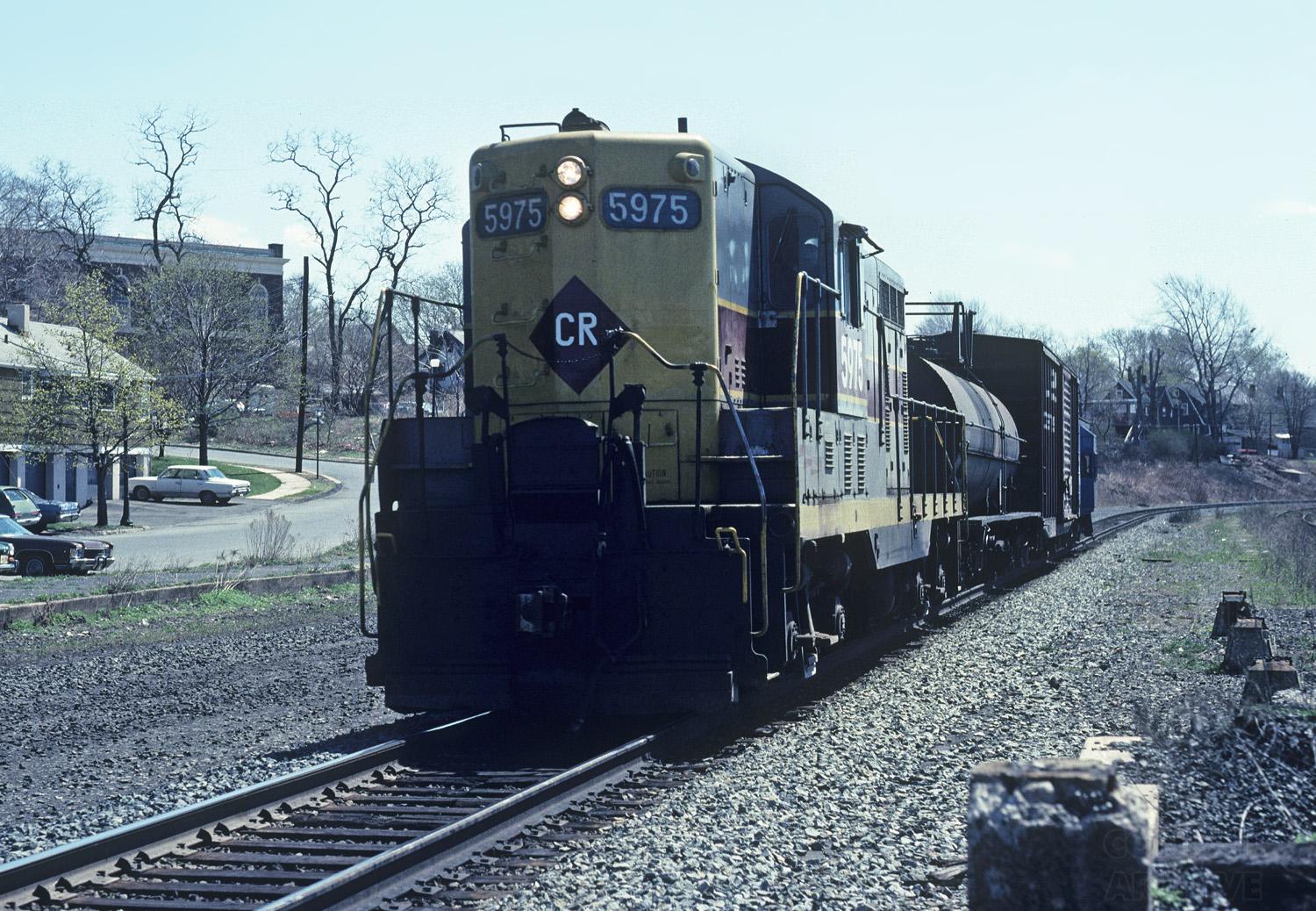 Local freight WH-1 sprints north at Ridgefield Park, NJ GP7 5975 exEL, nee Erie 1237 does the honors on the short train..