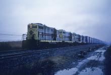 The Suffern Turn with four exEL GP7's rolls west about to pass under RT3 on 1/13/79