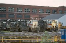 Former PC GP40 3123 awaits service alongside GP38-2 7955, ex-EL RS-3 1037, GP35 2271, and ex-EL GP-7 1242 (CR 5980) outside the Juniata Locomotive shops in August, 1977.