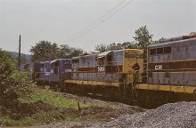 CR 5984 (ex-EL 1246) and CR blue 5973 (ex-EL 1235) run third and fourth in a quartet of former EL GP-7's at Bethlehem in July, 1979.