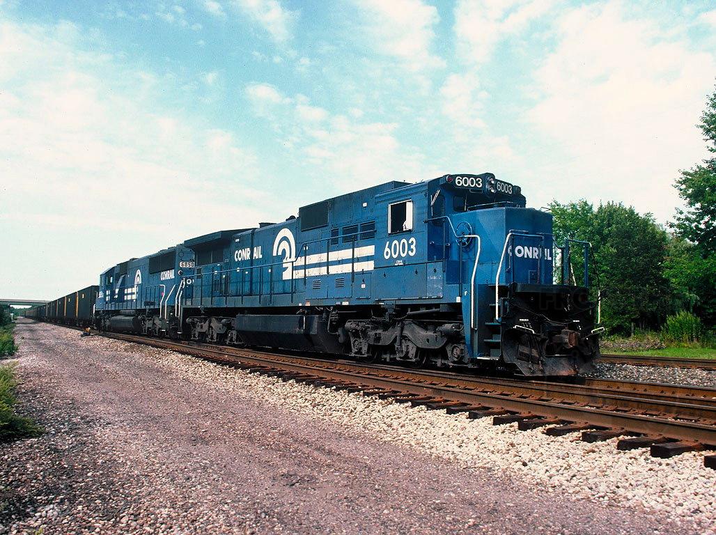 Conrail 6003 and CR 6850 lead southbound Conrail UNL-5B as it approaches Carson Rd. in Plymouth Twp., Ohio, [on Conrail's Youngstown Line].